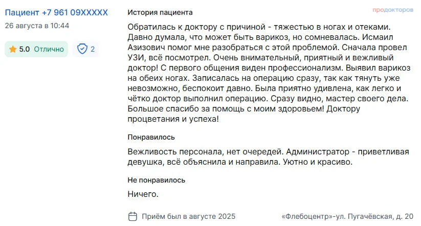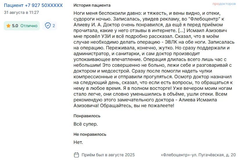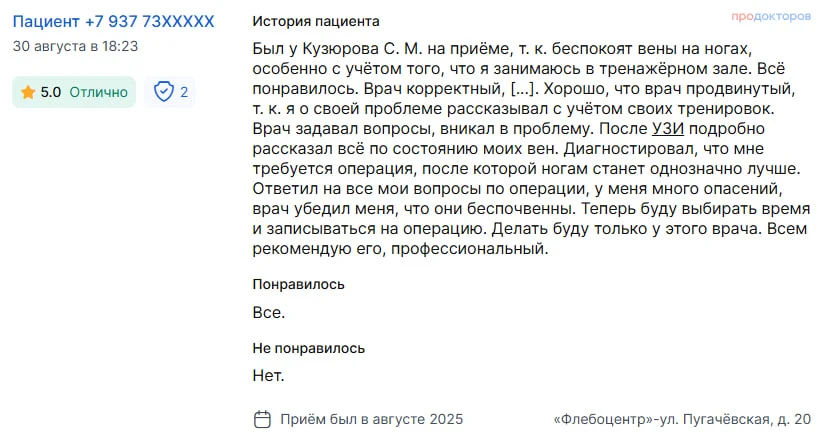 Вы получаете развёрнутые ответы на все вопросы от флеболога (сердечно-сосудистого хирурга)